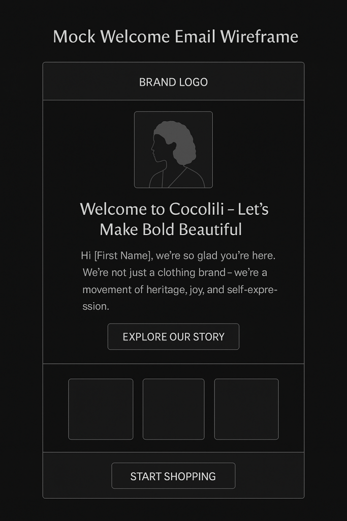 Wireframe layout of a welcome email designed for a lifestyle brand, showcasing CTA placement, visual hierarchy, and segmentation-friendly structure.